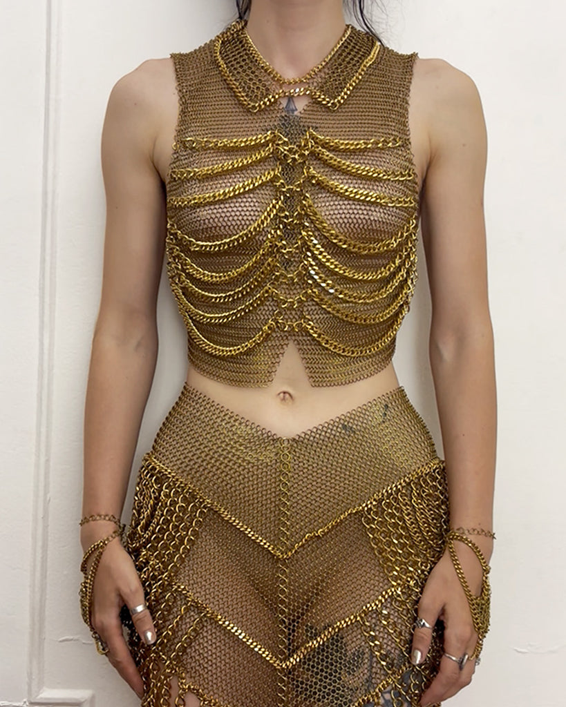 Falconiere ribcage vest. Halter vest with chainmail base and 8 rows of draped double link chunky chain. Chainmail collar bordered in bordered by chain. Notched center front hem. Lobster claw clasps at high and low back neck with adjustable chains. Lobster claw clasps at center back and straps with adjustable chains.