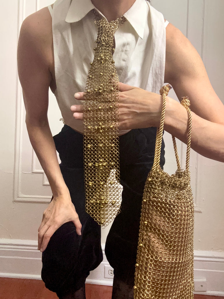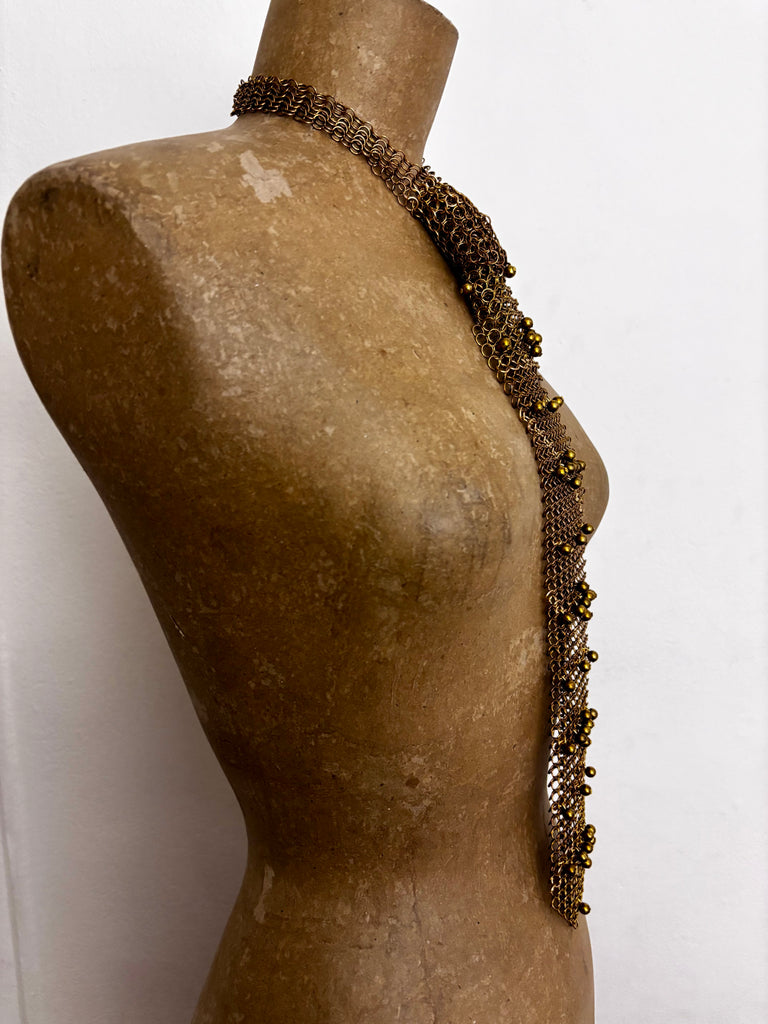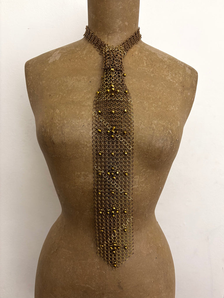 Falconiere brass chainmail tie with metal beaded floral abstract motif. Two layer long tie with fixed knot & adjustable back neck. Logo metal tag & lobster claw clasp
